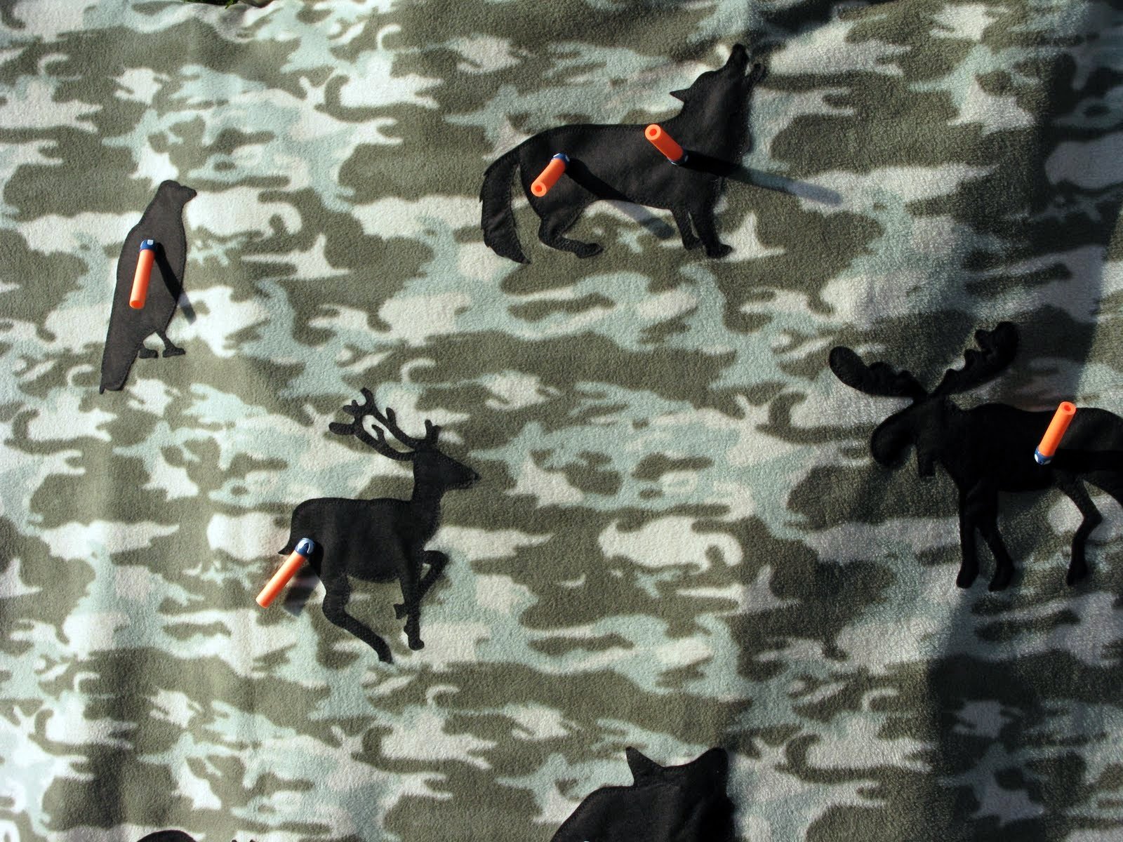 Choose a matching thread and experiment on the easiest shape first. Pin and sew one felt shape at a time to the blanket. I like to use lots of pins as the fleece is very stretchy.